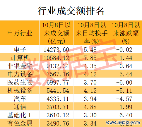 行业方面,科技类板块成交热度最高。据数据宝统计,本周电子、计算机行业成交额分别达到1.43万亿元、1.06万亿元,排在第一、第二位。紧随其后的是非银金融、电力设备、医药生物、机械设备行业,成交额均超5000亿元。